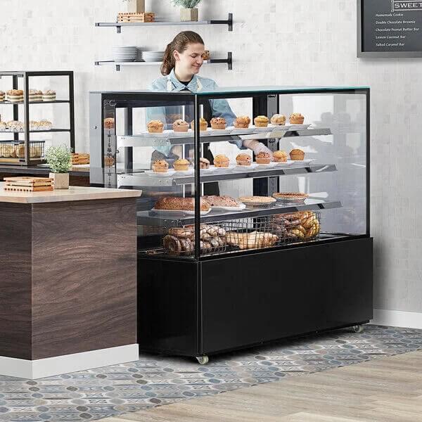 A dry display case is designed for non-perishable items like baked goods, pastries, and packaged snacks that don’t require cooling.